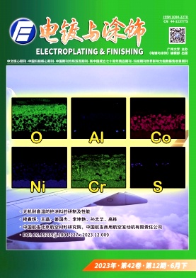 [目的]精细薄长有钩槽零件在三价铬电镀过程中常因电流密度和镀液传质不均引发细钩镀层烧焦、窄深长槽内壁漏镀等问题。[方法]分别在镀液静止与不同搅拌速率(200、400和600 r/min)条件下对精细薄长有钩槽零件进行三价铬电镀。通过扫描电镜(SEM)表征,结合力和显微硬度测试,以及摩擦磨损试验,研究了搅拌对零件不同部位Cr镀层微观形貌、结合力、显微硬度及耐磨性的影响。[结果]在电镀过程中对镀液进行适当搅拌能够显著提高精细薄长钩槽零件各部位镀层的分布均匀性和微观形貌,进而提高镀层的结合力、显微硬度、耐磨性等性能。[结论]镀液搅拌可有效解决零件细钩烧焦与槽内漏镀问题。镀液搅拌速率为400 r/min时,零件各部位的Cr镀层表面均匀、致密和平整,显微硬度最高,耐磨性最好。