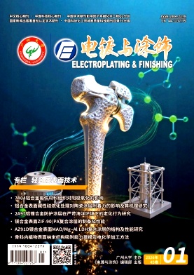 敖天近;曹俊斌;赵健伟;[目的]扩展无氰镀银工艺的工作窗口,提升其镀液及镀层的综合性能是无氰镀银工艺研究的长期目标。[方法]采用循环伏安法(CV)和计时电流法(CA),分析了不同温度下以碳酸银为主盐的无氰镀银体系中银的电沉积行为及其成核机理。通过铜库仑计法和远近阴极法研究了温度和电流密度对电流效率和镀液分散能力的影响,并考察了不同温度和电流密度下镀层的光泽度、白度、显微硬度和微观组织结构。[结果]碳酸银体系中银的电沉积过程不可逆,以连续成核为主,随温度升高而逐渐偏离该机制。推荐的电镀银工艺窗口为:温度25~35°C,电流密度1.0~3.0 A/dm2,温度和电流密度分别为(30±2)°C和(2.0±0.2) A/dm2时最佳。该体系的电流效率高于90%,分散能力为75%~100%,所得Ag镀层的整体性能较佳:显微硬度80~90 HV,光泽度200~400 GU,白度22~40 Wb,晶面择优取向为(111),晶粒尺寸为34.0~46.0 nm,结构细致均匀。[结论]本文研究的碳酸银体系无氰镀银工艺展现出良好的稳定性和可重复性,能够满足工业化生产的需求,同时避免了传统氰化物镀银工艺的环境污染风险,可为绿色电镀技术的发展提供新的解决方案。